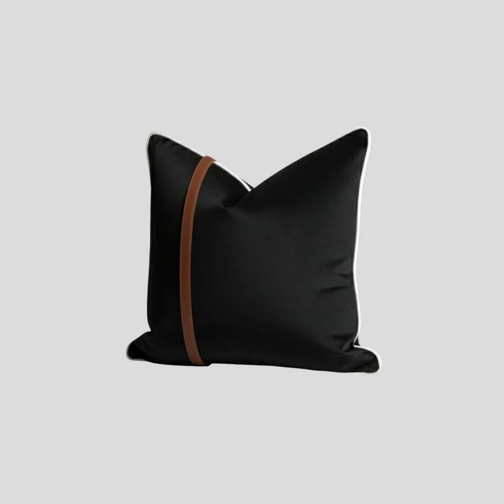 Elevate your décor with this modern black cushion, featuring a sleek silhouette accented by a stylish brown faux-leather belt detail. Its crisp white piping adds a refined contrast, making it a perfect statement piece for contemporary living rooms, bedrooms, or office spaces. Soft, durable, and effortlessly chic—this cushion brings luxury and minimalism together in one elegant design.