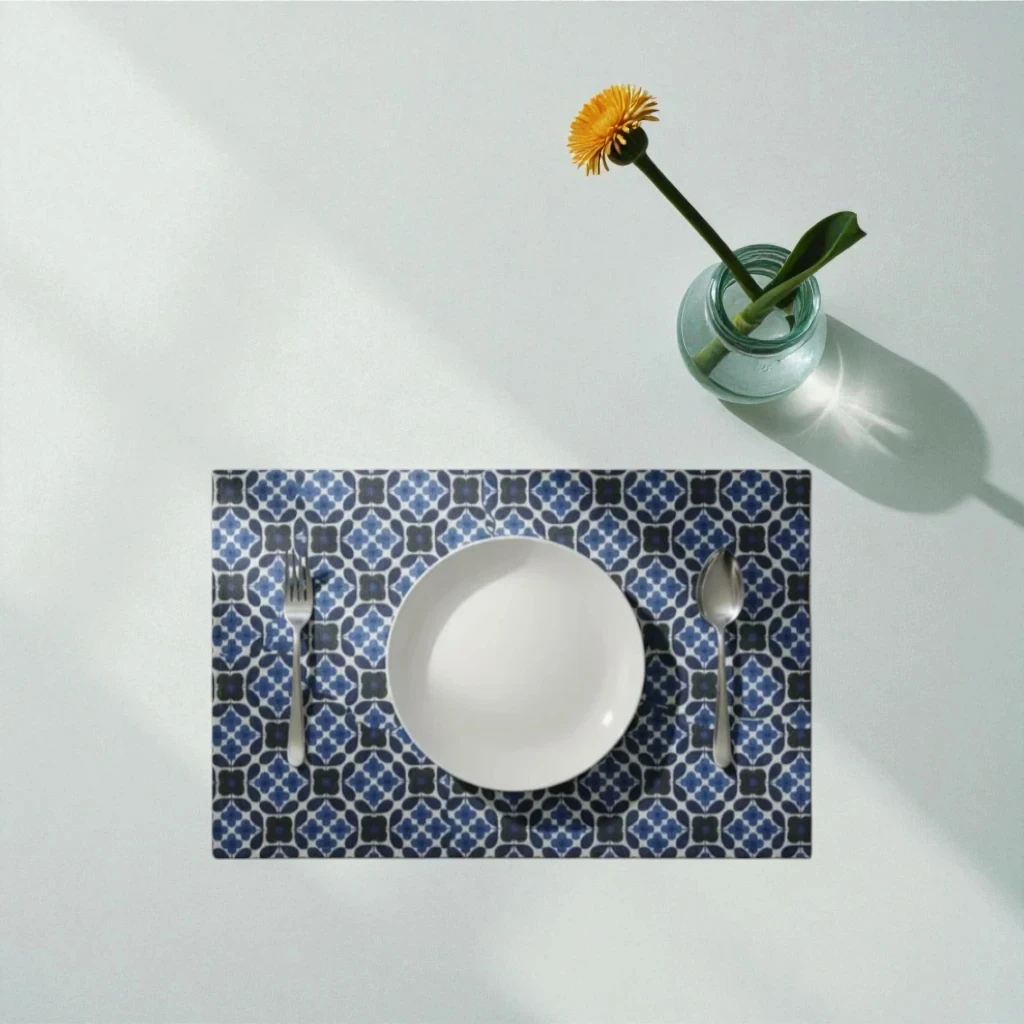 Measuring 13×18 inches, it offers ideal coverage for your plates, cutlery, and glassware while safeguarding your table from heat, spills, and scratches. The bold cobalt blue tones paired with intricate Moorish-style motifs create a striking, sophisticated look that instantly elevates any dining space.