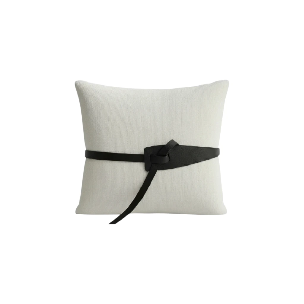 A stylish jute cushion accented with leather belt detailing — a perfect blend of rustic texture and modern elegance. Made to order — because luxury takes time.