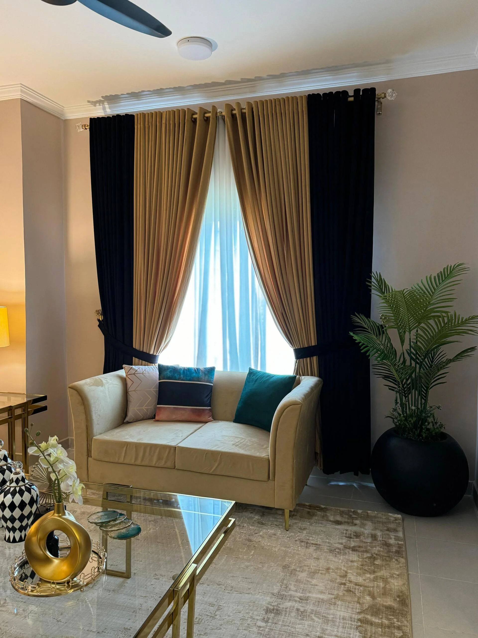 Our double-layer curtains, designed with a soft velvet panel in front and white sheer curtains at the back. This layered setup gives your room a neat, complete, and well-finished look while offering both coverage and natural light control.