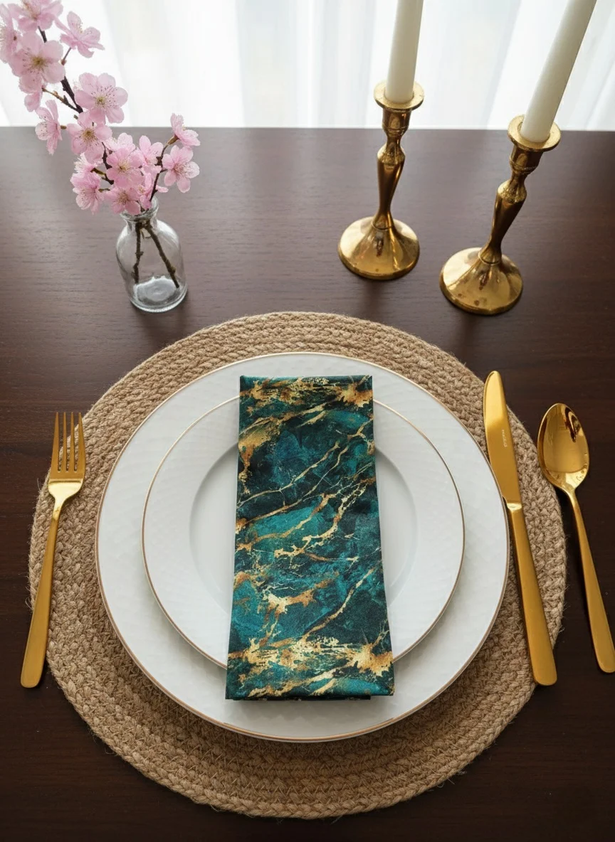 Add a luxurious touch to your dining experience with our Green and Gold Marble Napkins, beautifully crafted to elevate any table setting. Designed in a rich marble pattern that blends deep green tones with elegant gold accents, these napkins bring sophistication and style to every meal.