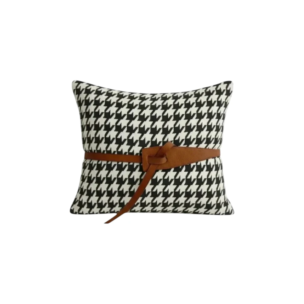 Elevate your décor with our Houndstooth Cushion featuring a Tan Leather Belt, a perfect fusion of classic pattern and modern style. Made from high-quality canvas fabric, this cushion showcases the timeless houndstooth design complemented by a sleek tan leather belt accent for a sophisticated finish. Measuring 16×16 inches, it offers both comfort and visual appeal ideal for sofas, chairs, or beds. The durable canvas provides texture and strength, while the leather detail adds a touch of elegance. Perfect for contemporary, rustic, or transitional interiors, this cushion brings refined charm and character to any living space. Our luxury pieces are crafted on order to ensure exceptional quality and detail. Every Signature by Fouzia Armani creation is made with purpose and patience.