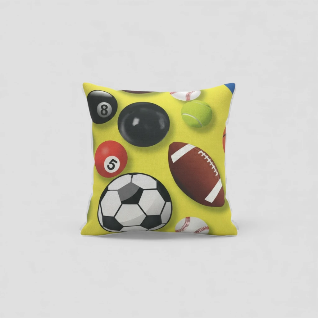 This bright, energetic cushion showcases a lively mix of realistic sports balls—including soccer, football, tennis, and billiards—against a bold yellow backdrop. It’s an ideal accessory for any budding athlete’s room or reading nook. The cushion is covered in tough Canvas Upholstery Fabric, built to withstand rough and tumble play.