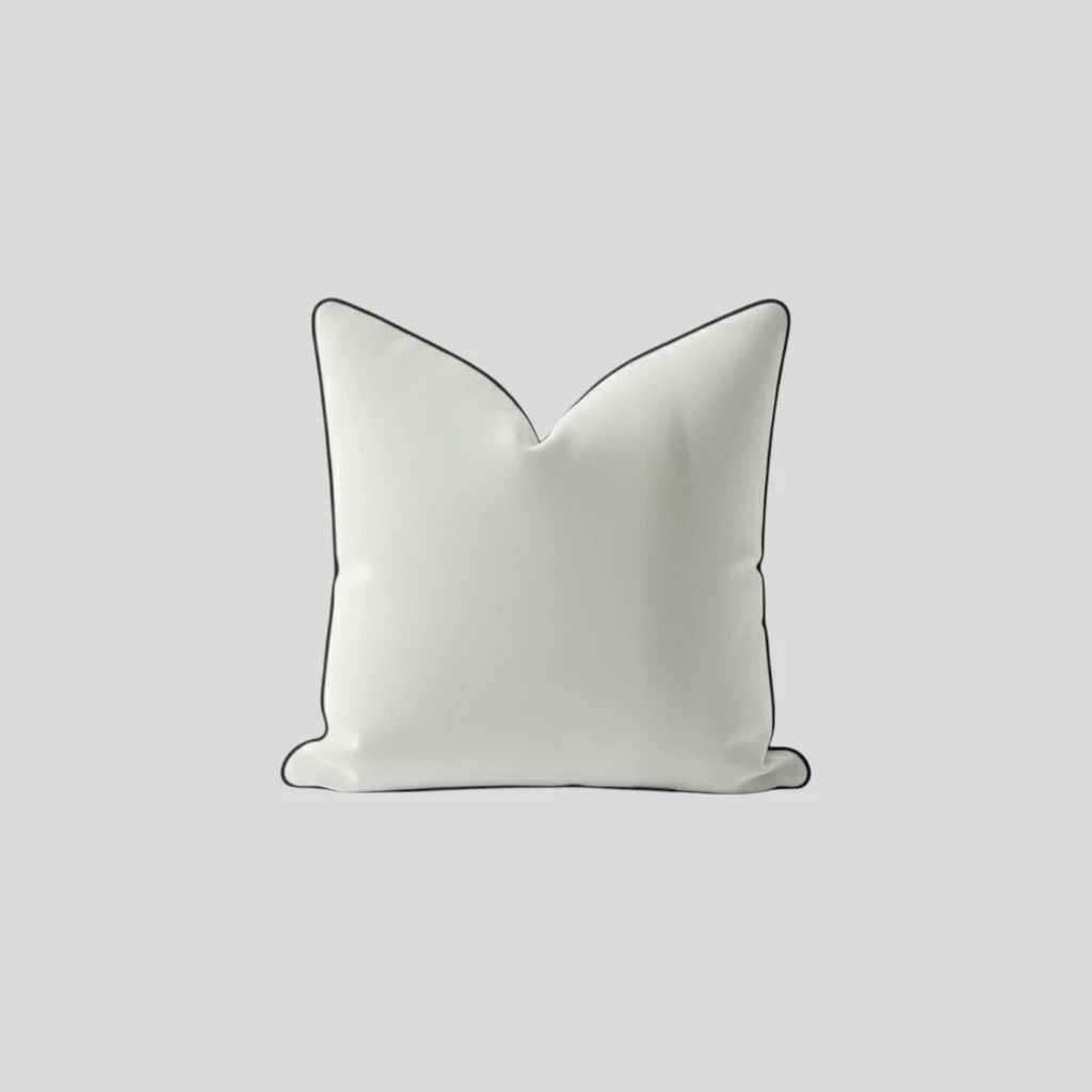 This cushion features a neutral velvet base finished with exquisitely crisp black piping along the edges.