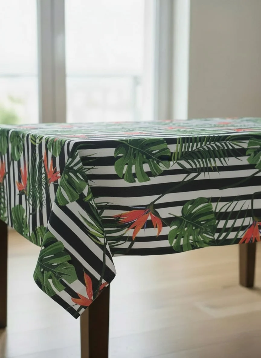 A striking contemporary print combining bold black and white horizontal stripes with large green monstera leaves and Bird of Paradise flowers.