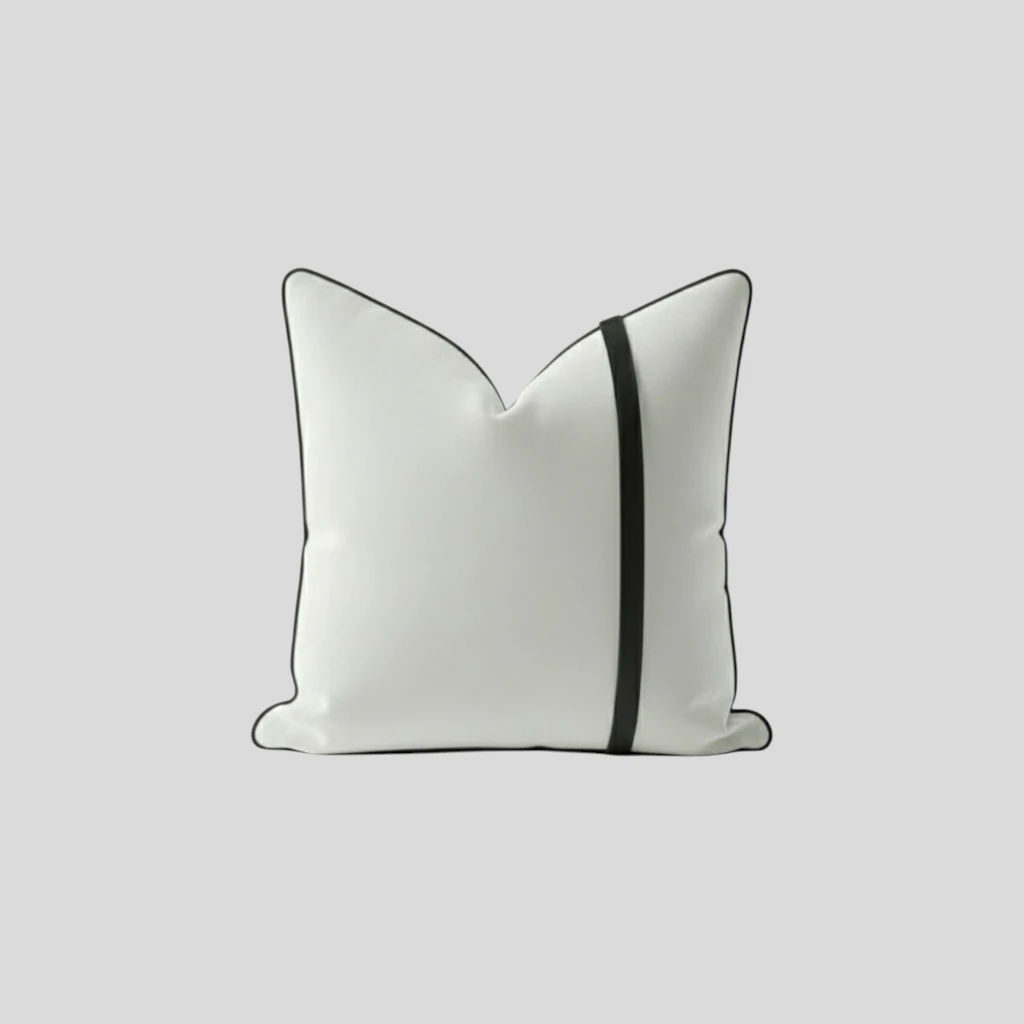 A modern white cushion with filling, designed with sleek black piping and a bold black strap detail for a refined contemporary look.